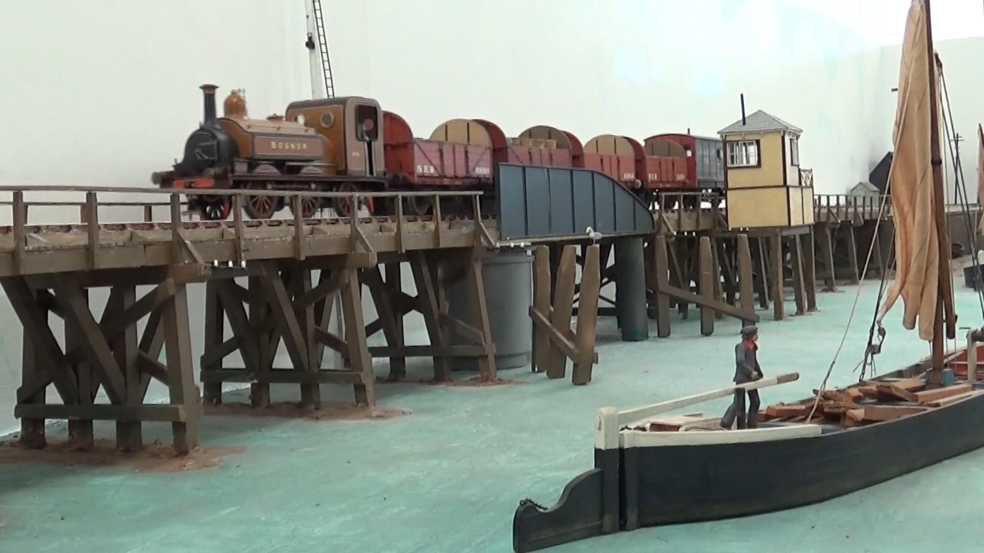 Baseboards were constructed of good quality ply. The track is laid on cork with two three-way tandem turnouts by Marcway and plain track by C&L. Turnout operation is by Tortoise slow action motors controlled from an ancient lever frame: working slotted signals will be added later. Ballast is a mixture of chinchilla dust, fine sand and cork granules. Langstone Bridge replicates the construction of the prototype and, positioned close to the backscene and with short rail lengths, the sound of trains passing over it is accentuated. In the foreground is an Arun sailing barge, beautifully built by Peter Korrison. Electrics have been kept as simple as possible with DC control by Gaugemaster hand held units. There are two operating positions, either of which can be switched out so that trains are always driven towards you. The wharf was added so that with two operators, activity in the fiddle yard balances that at the terminus. Raising the lifting section cuts off power to the station to avoid accidents!