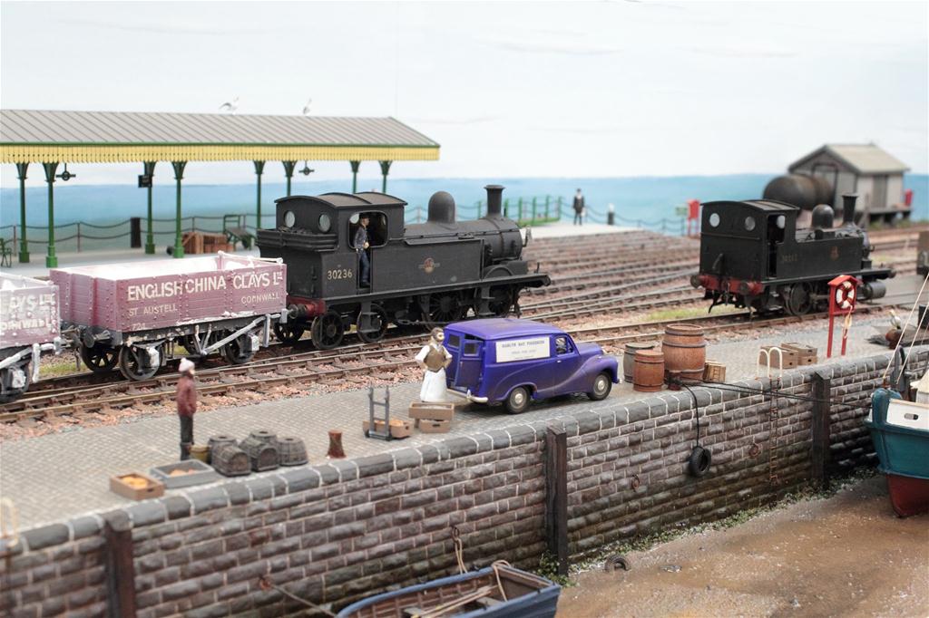 The layout depicts the terminus of an imaginary (ex LSWR) branch line on the north coast of Cornwall not far from Padstow in the BR period circa 1960 and is built to ‘O’ gauge finescale standards. The majority of the buildings are scratch built and based on examples from the Cornwall or Devon area. The signals and level crossing gates are all operational and interlocked with the points. For further details please visit the website www.harlynpier.weebly.com